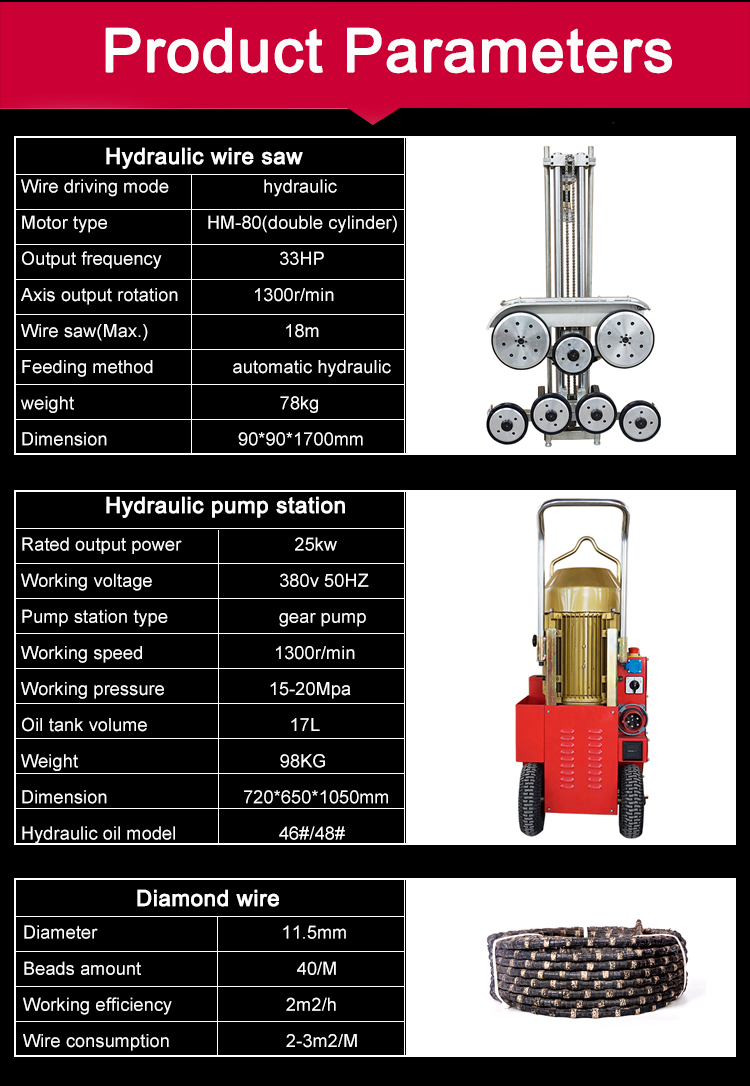 1. Hydraulic-driven, Diamond Wire Saw Machine can work in different situations. 2. It's made of hard materials. The wedges are running stability. Long surviving life. 3. Powerful cutting ability, it can split the stone or concrete easily with no cutting depth limitation. 4. High Efficiency, and it's easy and comfortable to operate and maintain.